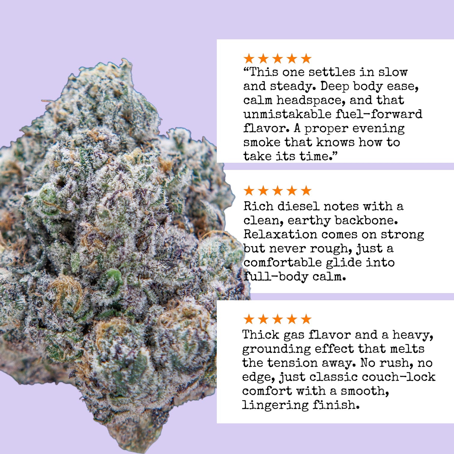 Sharp diesel hits first, followed by earthy kush and a touch of citrus-pine brightness. Bold and unmistakable, the flavor lingers with a rich, fuel-heavy finish that gas lovers know and respect. Smooth on the inhale, steady on the exhale — strong without being harsh.