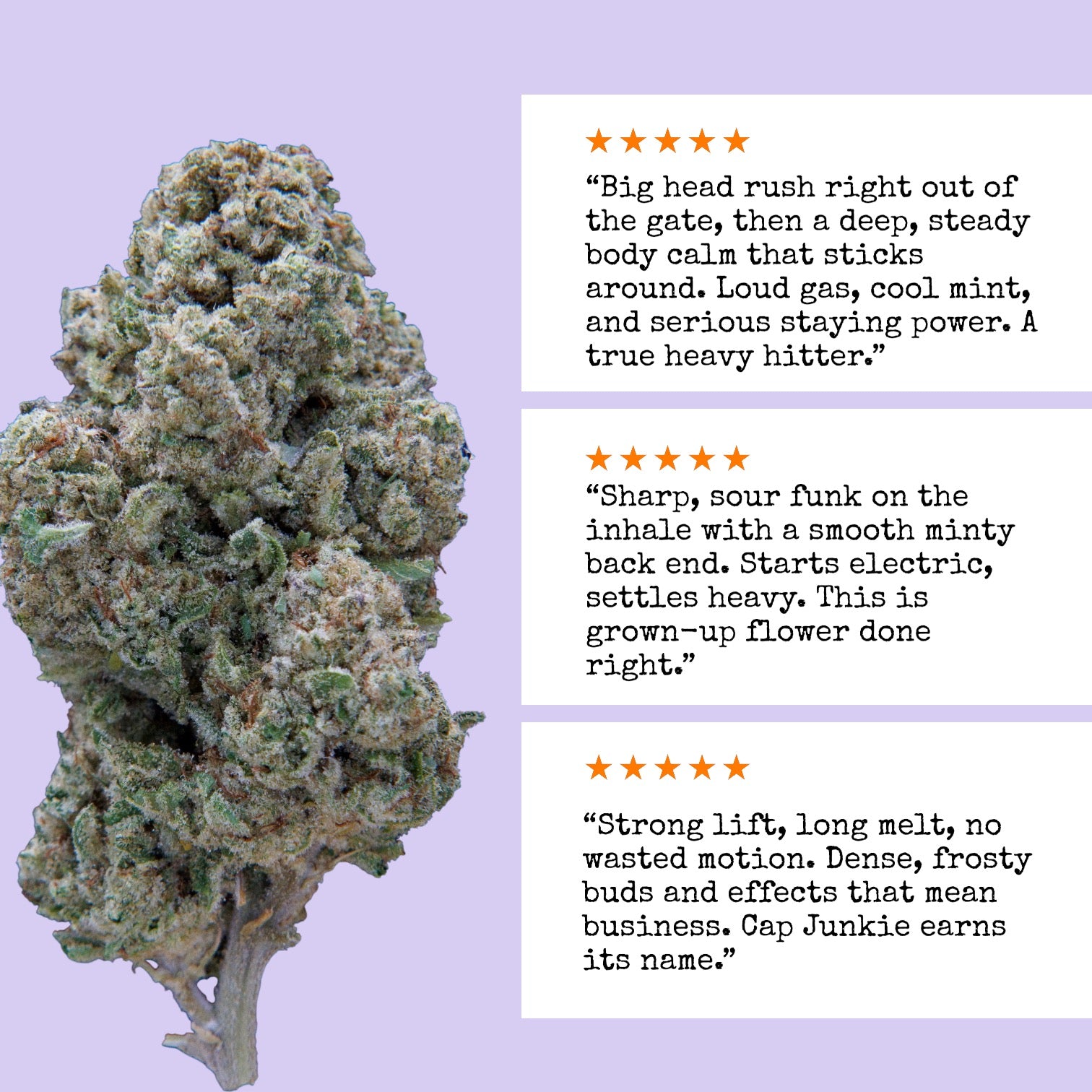 Sour gas and earthy pine lead the charge, followed by a cool minty cream that lingers long after the exhale. Loud, layered, and unmistakably rich, Cap Junkie delivers a full-bodied smoke with a clean, assertive finish.