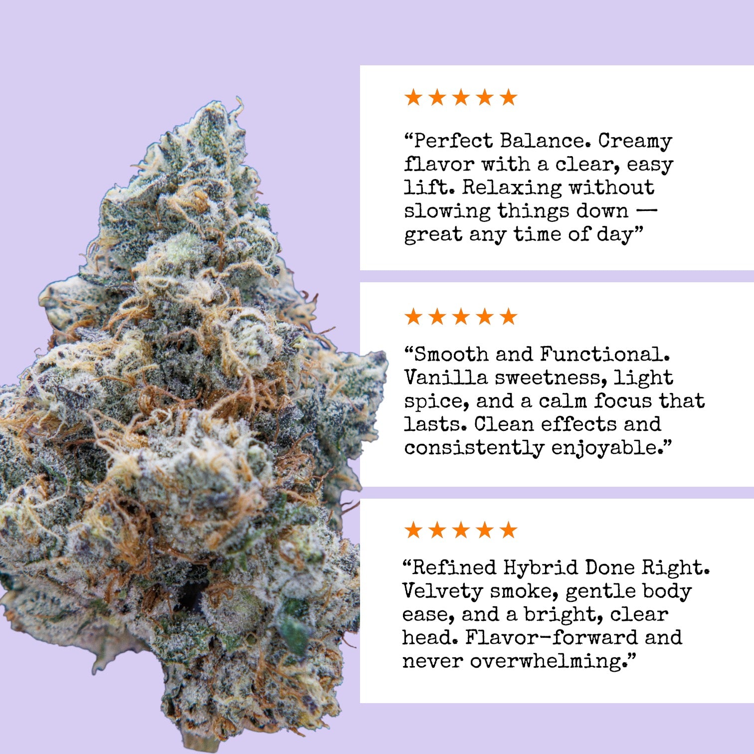 Clear-headed euphoria pairs with gentle body relaxation, promoting improved mood, creativity, and functional calm. Balanced and versatile, Horchata is equally suited for daytime focus or evening unwinding.